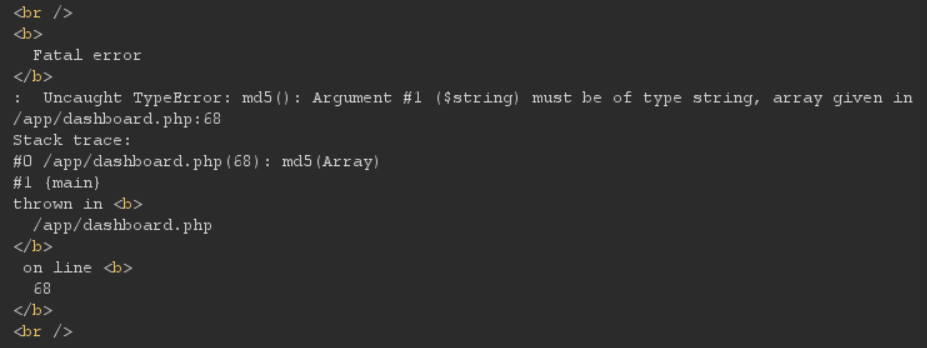We can see we're in the middle of a call to md5() with the string to hash being the value of the account_type cookie. Also, importantly we notice the code file is at /app/dashboard.php on the filesystem.